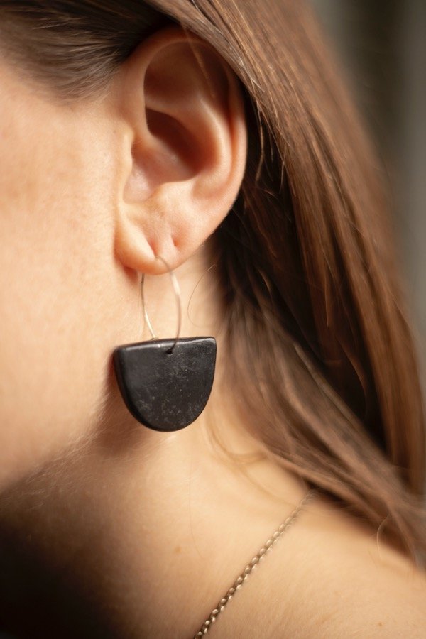 Esta pieza está hecha de barro moldeado a mano, bruñido con piedras, horneado a leña, llevado a negro con técnica de reducción y curado con cera de soja.